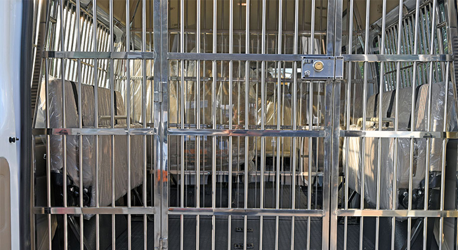 囚室包含前部隔斷、尾部隔斷和側窗隔斷,全為不銹鋼柵欄型,結構牢固可靠。