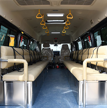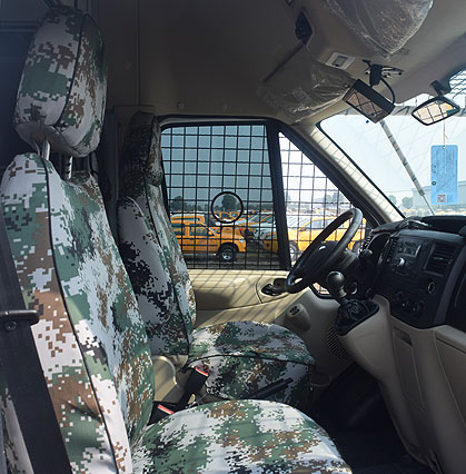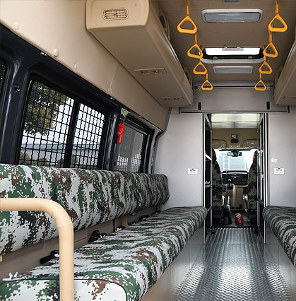 車內兩側各設置一組鋼制長條座柜,上部配備高密度汽車海綿沙發,外包真皮面料,沙發套迷彩座椅布套,可拆卸更換,柜體通過掀開坐墊可存放裝備。