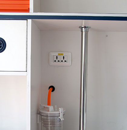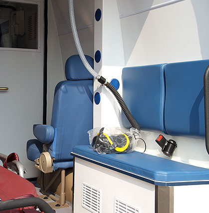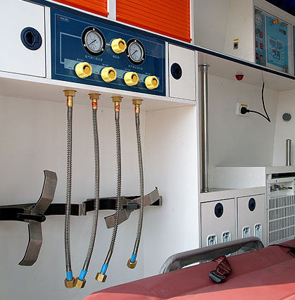 配備具有國家專利的專用車載氧氣集中控制系統(專利號:ZL 2011 2 0392027.1,ZL 2016 2 1466443.0 ),可直觀地觀察高壓和低壓表的實時顯示;病人呼吸時,氧氣時可恒壓調節,耐使用且不易漏氣。