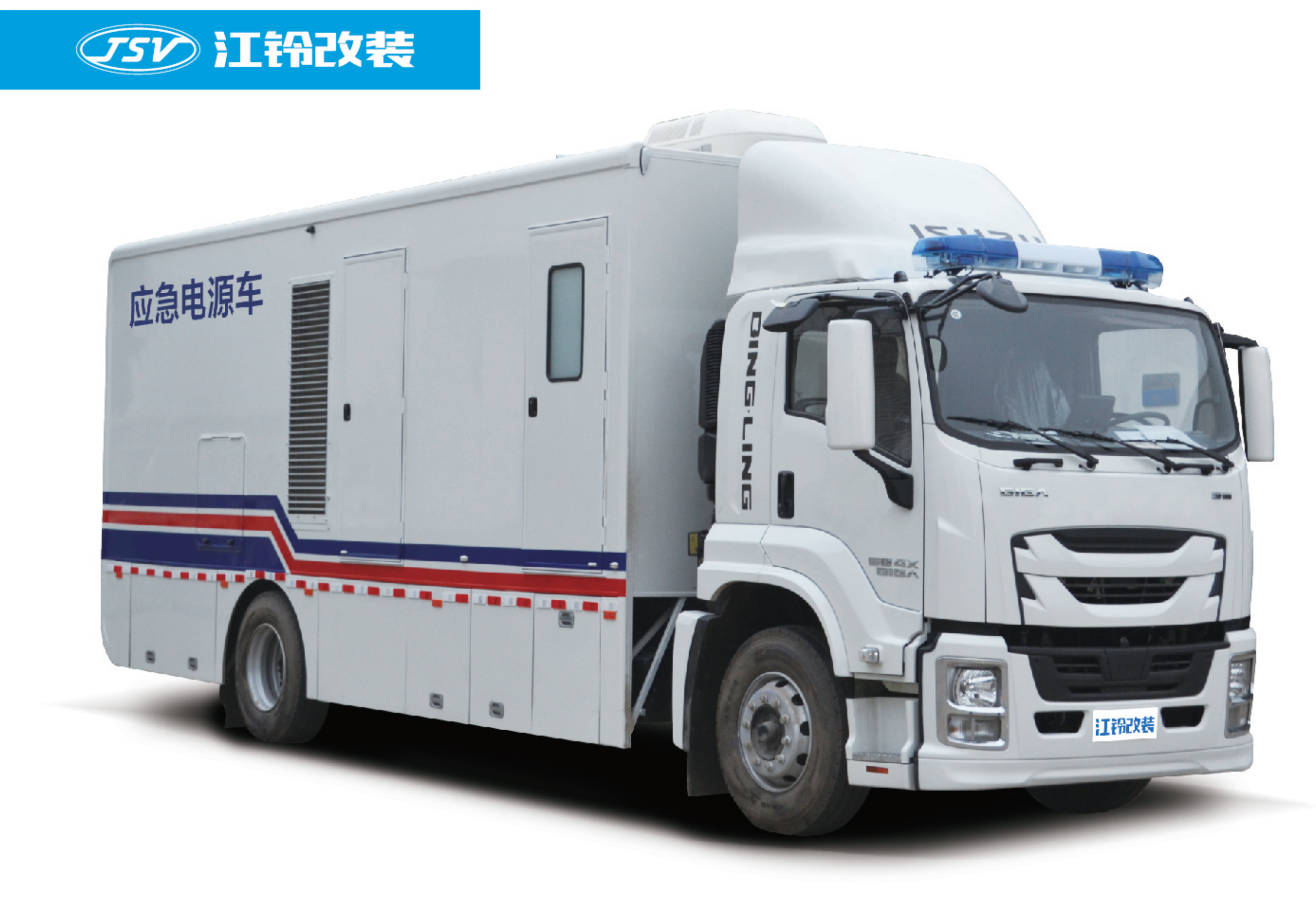 JSV江鈴改裝電源車采用重卡底盤改裝,根據實際需求配備大功率發電機組、降噪散熱系統、控制系統、照明系統等,滿足應急救援現場應急供電需求,也可以給其他車輛加油。