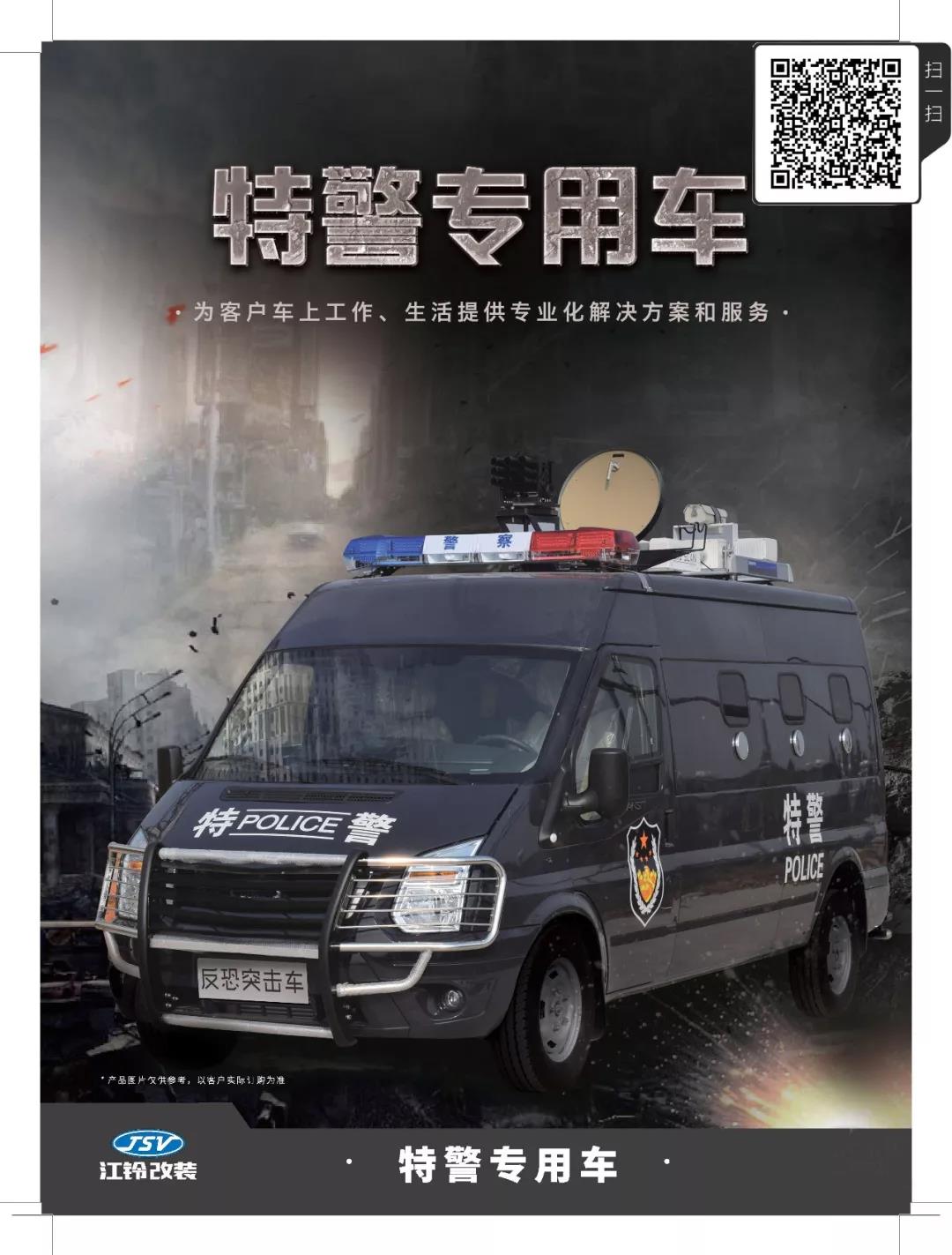 JSV江鈴改裝宿營車配備了雙向拓展廂體系統、空氣調節系統、宿營設施、影音系統、電氣系統、通風換氣系統、洗漱和衛生設施、警示系統、附助裝置及外觀裝飾等,可提供24人的野外勤務宿營需求,滿足公安特警在野外執行任務、訓練及臨時駐扎時的宿營需要,提高外出執行人員后勤綜合保障任務的能力。