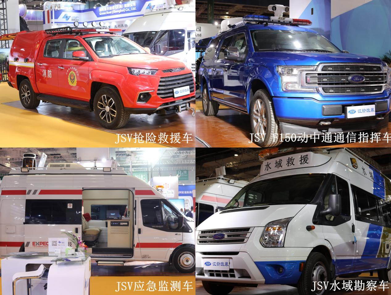 此次展會上,JSV江鈴改裝共展出四款應急保障專用車輛,分別為:JSV搶險救援車、JSV F150動中通通信指揮車、JSV應急監測車、JSV水域勘察車。