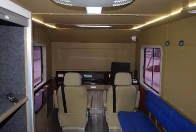 (3)設施方面:①車頂360度云臺攝像頭對周邊環境實時監控,并可實時向指揮中心傳輸監控信號;②警用裝備柜, 存放各類警用裝備;③車身開設多個咨詢窗口, 更能給群眾一種親民的感覺,提升警民關系。